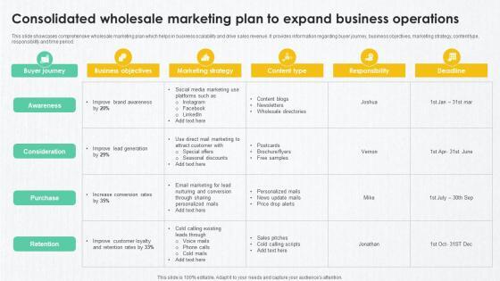 This slide showcases comprehensive wholesale marketing plan which helps in business scalability and drive sales revenue. It provides information regarding buyer journey, business objectives, marketing strategy, content type, responsibility and time period. Make sure to capture your audiences attention in your business displays with our gratis customizable B2B Marketing Techniques Consolidated Wholesale Marketing Plan To Expand Business. These are great for business strategies, office conferences, capital raising or task suggestions. If you desire to acquire more customers for your tech business and ensure they stay satisfied, create your own sales presentation with these plain slides. This slide showcases comprehensive wholesale marketing plan which helps in business scalability and drive sales revenue. It provides information regarding buyer journey, business objectives, marketing strategy, content type, responsibility and time period.
