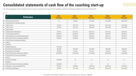 The slides highlight the cash flow statement of the company. It represents net cash flow from operating, investing, and financing activities from the year 2023 till 2027. Create an editable Consolidated Statements Of Cash Flow Coaching Business Plan Financial Projections Introduction Pdf that communicates your idea and engages your audience. Whether you are presenting a business or an educational presentation, pre-designed presentation templates help save time. Consolidated Statements Of Cash Flow Coaching Business Plan Financial Projections Introduction Pdf is highly customizable and very easy to edit, covering many different styles from creative to business presentations. Slidegeeks has creative team members who have crafted amazing templates. So, go and get them without any delay. The slides highlight the cash flow statement of the company. It represents net cash flow from operating, investing, and financing activities from the year 2023 till 2027.