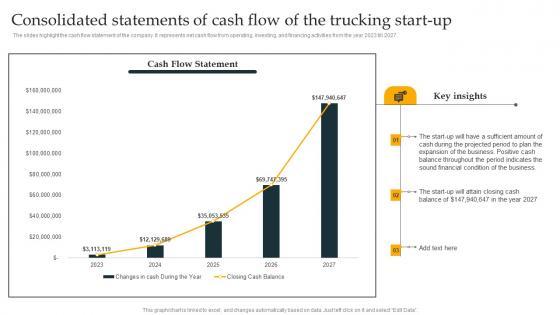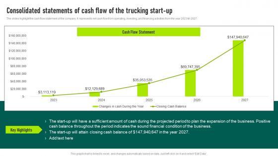 The slides highlight the cash flow statement of the company. It represents net cash flow from operating, investing, and financing activities from the year 2023 till 2027.There are so many reasons you need a Consolidated Statements Of Cash Flow Trucking Services Business Plan Infographics Pdf The first reason is you can not spend time making everything from scratch, Thus, Slidegeeks has made presentation templates for you too. You can easily download these templates from our website easily. The slides highlight the cash flow statement of the company. It represents net cash flow from operating, investing, and financing activities from the year 2023 till 2027.