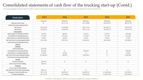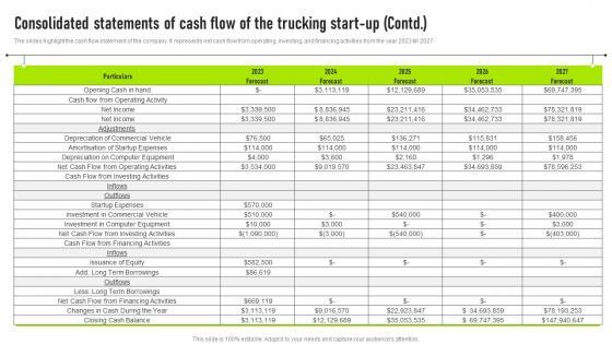 The slides highlight the cash flow statement of the company. It represents net cash flow from operating, investing, and financing activities from the year 2023 till 2027.There are so many reasons you need a Consolidated Statements Of Cash Flow Freight Trucking Business Plan Inspiration Pdf The first reason is you can not spend time making everything from scratch, Thus, Slidegeeks has made presentation templates for you too. You can easily download these templates from our website easily. The slides highlight the cash flow statement of the company. It represents net cash flow from operating, investing, and financing activities from the year 2023 till 2027.