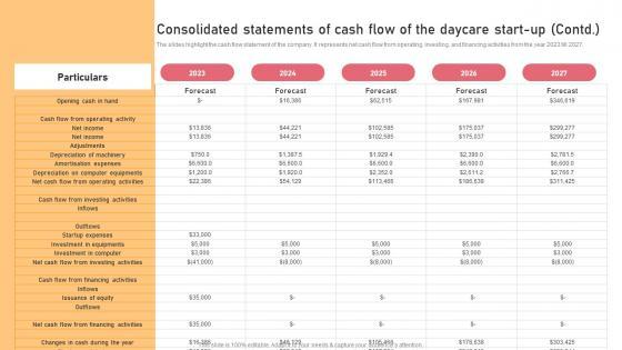 The slides highlight the cash flow statement of the company. It represents net cash flow from operating, investing, and financing activities from the year 2023 till 2027. There are so many reasons you need a Consolidated Statements Of Cash Flow Of The Daycare Childcare Business Plan Mockup Pdf. The first reason is you can not spend time making everything from scratch, Thus, Slidegeeks has made presentation templates for you too. You can easily download these templates from our website easily. The slides highlight the cash flow statement of the company. It represents net cash flow from operating, investing, and financing activities from the year 2023 till 2027.