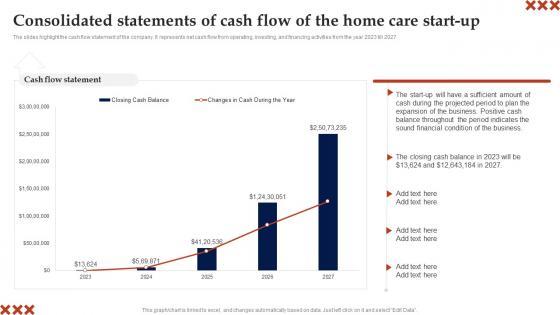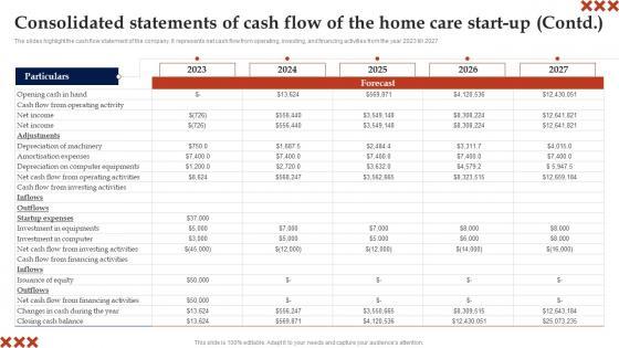 The slides highlight the cash flow statement of the company. It represents net cash flow from operating, investing, and financing activities from the year 2023 till 2027. There are so many reasons you need a Consolidated Statements Of Cash Flow Of The In Home Care Business Plan Mockup Pdf. The first reason is you can not spend time making everything from scratch, Thus, Slidegeeks has made presentation templates for you too. You can easily download these templates from our website easily. The slides highlight the cash flow statement of the company. It represents net cash flow from operating, investing, and financing activities from the year 2023 till 2027.