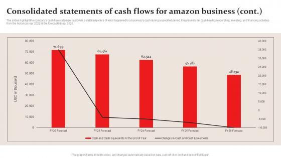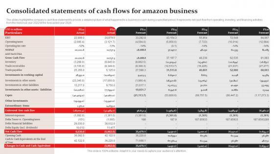 The slides highlight the companys cash flow statement to provide a detailed picture of what happened to a businesss cash during a specified period. It represents net cash flow from operating, investing, and financing activities from the historical year 2022 till the forecasted year 2026. Find highly impressive Consolidated Statements Of Cash Flows Amazon Business Plan Go To Market Strategy Summary Pdf on Slidegeeks to deliver a meaningful presentation. You can save an ample amount of time using these presentation templates. No need to worry to prepare everything from scratch because Slidegeeks experts have already done a huge research and work for you. You need to download Consolidated Statements Of Cash Flows Amazon Business Plan Go To Market Strategy Summary Pdf for your upcoming presentation. All the presentation templates are 100 percent editable and you can change the color and personalize the content accordingly. Download now The slides highlight the companys cash flow statement to provide a detailed picture of what happened to a businesss cash during a specified period. It represents net cash flow from operating, investing, and financing activities from the historical year 2022 till the forecasted year 2026.