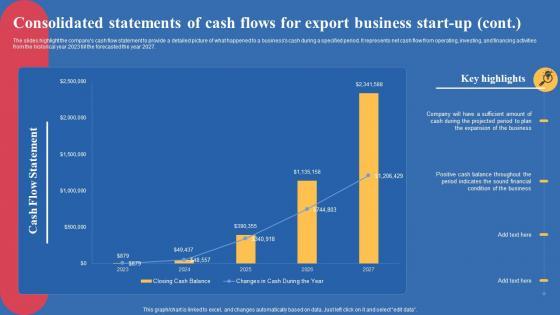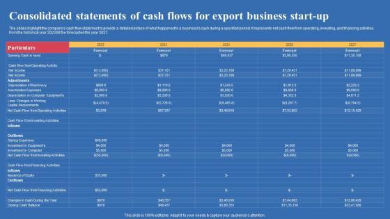 The slides highlight the companys cash flow statement to provide a detailed picture of what happened to a businesss cash during a specified period. It represents net cash flow from operating, investing, and financing activities from the historical year 2023 till the forecasted the year 2027. Get a simple yet stunning designed Consolidated Statements Of Cash Flows For Export Business Start Up Export Business Plan Professional Pdf It is the best one to establish the tone in your meetings. It is an excellent way to make your presentations highly effective. So, download this PPT today from Slidegeeks and see the positive impacts. Our easy-to-edit Consolidated Statements Of Cash Flows For Export Business Start Up Export Business Plan Professional Pdf can be your go-to option for all upcoming conferences and meetings. So, what are you waiting for Grab this template today. The slides highlight the companys cash flow statement to provide a detailed picture of what happened to a businesss cash during a specified period. It represents net cash flow from operating, investing, and financing activities from the historical year 2023 till the forecasted the year 2027.
