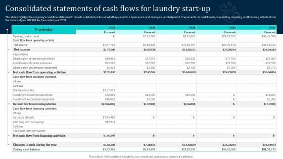 Get a simple yet stunning designed Consolidated Statements Of Cash Flows On Demand Laundry Business Plan Rules Pdf It is the best one to establish the tone in your meetings. It is an excellent way to make your presentations highly effective. So, download this PPT today from Slidegeeks and see the positive impacts. Our easy to edit Consolidated Statements Of Cash Flows On Demand Laundry Business Plan Rules Pdf can be your go to option for all upcoming conferences and meetings. So, what are you waiting for Grab this template today. The slides highlight the companys cash flow statement to provide a detailed picture of what happened to a businesss cash during a specified period. It represents net cash flow from operating, investing, and financing activities from the historical year 2023 till the forecasted year 2027.