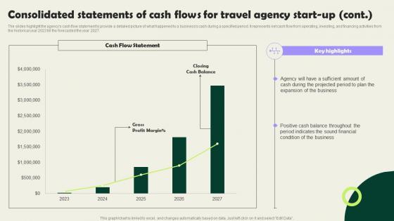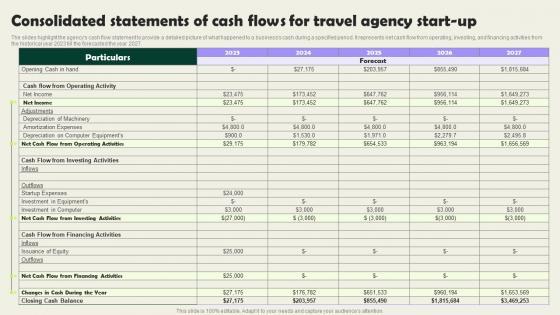 The slides highlight the agencys cash flow statement to provide a detailed picture of what happened to a businesss cash during a specified period. It represents net cash flow from operating, investing, and financing activities from the historical year 2023 till the forecasted the year 2027. If you are looking for a format to display your unique thoughts, then the professionally designed Consolidated Statements Of Cash Flows For Travel Agency Vacation Planning Business Elements Pdf is the one for you. You can use it as a Google Slides template or a PowerPoint template. Incorporate impressive visuals, symbols, images, and other charts. Modify or reorganize the text boxes as you desire. Experiment with shade schemes and font pairings. Alter, share or cooperate with other people on your work. Download Consolidated Statements Of Cash Flows For Travel Agency Vacation Planning Business Elements Pdf and find out how to give a successful presentation. Present a perfect display to your team and make your presentation unforgettable. The slides highlight the agencys cash flow statement to provide a detailed picture of what happened to a businesss cash during a specified period. It represents net cash flow from operating, investing, and financing activities from the historical year 2023 till the forecasted the year 2027.