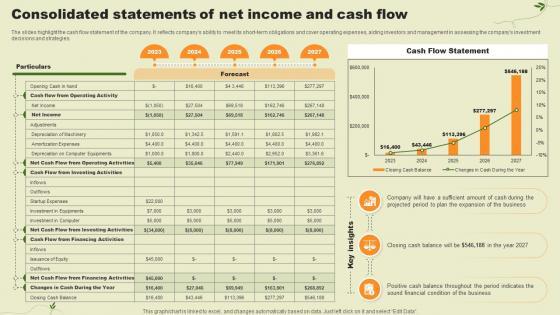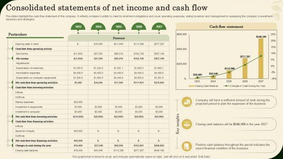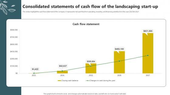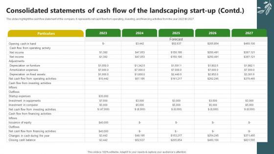 The slides highlight the cash flow statement of the company. It reflects companys ability to meet its short-term obligations and cover operating expenses, aiding investors and management in assessing the companys investment decisions and strategies. Get a simple yet stunning designed Consolidated Statements Of Net Income And Cash Flow Landscaping Business Plan Ppt Template BP SS V It is the best one to establish the tone in your meetings. It is an excellent way to make your presentations highly effective. So, download this PPT today from Slidegeeks and see the positive impacts. Our easy-to-edit Consolidated Statements Of Net Income And Cash Flow Landscaping Business Plan Ppt Template BP SS V can be your go-to option for all upcoming conferences and meetings. So, what are you waiting for Grab this template today. The slides highlight the cash flow statement of the company. It reflects companys ability to meet its short-term obligations and cover operating expenses, aiding investors and management in assessing the companys investment decisions and strategies.