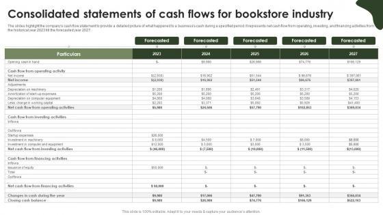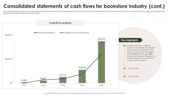 The slides highlight the companys cash flow statement to provide a detailed picture of what happened to a business cash during a specified period. It represents net cash flow from operating, investing, and financing activities from the historical year 2023 till the forecasted year 2027. Slidegeeks is here to make your presentations a breeze with Online Bookstore Business Plan Consolidated Statements Of Cash Flows For Bookstore Industry BP SS V With our easy-to-use and customizable templates, you can focus on delivering your ideas rather than worrying about formatting. With a variety of designs to choose from, you are sure to find one that suits your needs. And with animations and unique photos, illustrations, and fonts, you can make your presentation pop. So whether you are giving a sales pitch or presenting to the board, make sure to check out Slidegeeks first The slides highlight the companys cash flow statement to provide a detailed picture of what happened to a business cash during a specified period. It represents net cash flow from operating, investing, and financing activities from the historical year 2023 till the forecasted year 2027.