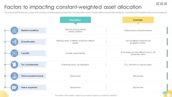 This slide presents the factors to consider when selecting a constant-weighted asset allocation. It includes factors such as market conditions, diversification, liquidity, tax consideration, historical performance and fees and expenses.Coming up with a presentation necessitates that the majority of the effort goes into the content and the message you intend to convey. The visuals of a PowerPoint presentation can only be effective if it supplements and supports the story that is being told. Keeping this in mind our experts created Factors To Impacting Constant Weighted Asset Strategic Investment Plan For Optimizing Risk SS V to reduce the time that goes into designing the presentation. This way, you can concentrate on the message while our designers take care of providing you with the right template for the situation. This slide presents the factors to consider when selecting a constant-weighted asset allocation. It includes factors such as market conditions, diversification, liquidity, tax consideration, historical performance and fees and expenses.