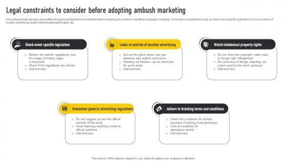 This slide provides glimpse about different legal considerations to undertake before adopting any ambush marketing campaign or strategy. It includes considerations such as check event specific legislation, looks at controls of location advertising, watch intellectual property rights, etc. The best PPT templates are a great way to save time, energy, and resources. Slidegeeks have 100 percent editable powerpoint slides making them incredibly versatile. With these quality presentation templates, you can create a captivating and memorable presentation by combining visually appealing slides and effectively communicating your message. Download Legal Constraints To Consider Before Adopting Ambush Automate Guerrilla Promotional Icons Pdf from Slidegeeks and deliver a wonderful presentation. This slide provides glimpse about different legal considerations to undertake before adopting any ambush marketing campaign or strategy. It includes considerations such as check event specific legislation, looks at controls of location advertising, watch intellectual property rights, etc.