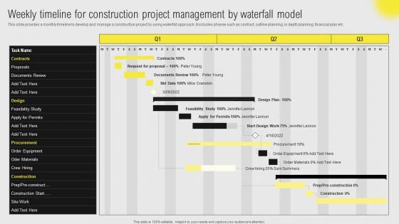 This slide provides a monthly timeline to develop and manage a construction project by using waterfall approach. It includes phases such as contract, outline planning, in depth planning, financial plan etc. Coming up with a presentation necessitates that the majority of the effort goes into the content and the message you intend to convey. The visuals of a PowerPoint presentation can only be effective if it supplements and supports the story that is being told. Keeping this in mind our experts created IT Projects Administration Through Waterfall Weekly Timeline For Construction Project Elements Pdf to reduce the time that goes into designing the presentation. This way, you can concentrate on the message while our designers take care of providing you with the right template for the situation. This slide provides a monthly timeline to develop and manage a construction project by using waterfall approach. It includes phases such as contract, outline planning, in depth planning, financial plan etc.