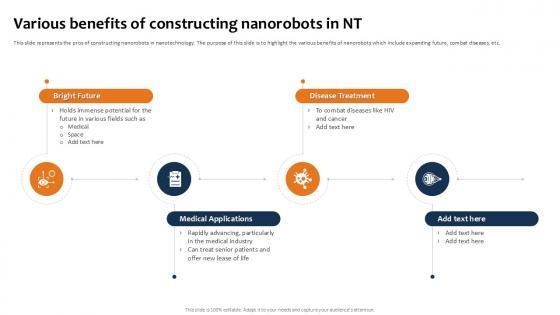 This slide represents the pros of constructing nanorobots in nanotechnology. The purpose of this slide is to highlight the various benefits of nanorobots which include expanding future, combat diseases, etc.Do you have an important presentation coming up Are you looking for something that will make your presentation stand out from the rest Look no further than Various Benefits Of Constructing Building The Future Of Robotic Ppt Example. With our professional designs, you can trust that your presentation will pop and make delivering it a smooth process. And with Slidegeeks, you can trust that your presentation will be unique and memorable. So why wait Grab Various Benefits Of Constructing Building The Future Of Robotic Ppt Example today and make your presentation stand out from the rest This slide represents the pros of constructing nanorobots in nanotechnology. The purpose of this slide is to highlight the various benefits of nanorobots which include expanding future, combat diseases, etc.