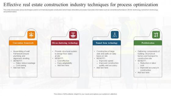 This slide showcases various techniques used in commercial property construction which helps streamline processes. It provides information such as conventional framework, MIVAN technology, tunnel form technology and prefabrication. Showcasing this set of slides titled Effective Real Estate Construction Industry Techniques For Process Optimization Summary Pdf. The topics addressed in these templates are Convention Framework, Tunnel Form Technology, Prefabrication. All the content presented in this PPT design is completely editable. Download it and make adjustments in color, background, font etc. as per your unique business setting. This slide showcases various techniques used in commercial property construction which helps streamline processes. It provides information such as conventional framework, MIVAN technology, tunnel form technology and prefabrication.