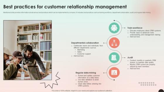Mentioned slide provides information about various best practices which can be implemented by company. It includes best practices such as training workforce, department collaboration, audit, and regular data mining. Slidegeeks is here to make your presentations a breeze with Web Consulting Business Best Practices For Customer Relationship Management With our easy-to-use and customizable templates, you can focus on delivering your ideas rather than worrying about formatting. With a variety of designs to choose from, you are sure to find one that suits your needs. And with animations and unique photos, illustrations, and fonts, you can make your presentation pop. So whether you are giving a sales pitch or presenting to the board, make sure to check out Slidegeeks first Mentioned slide provides information about various best practices which can be implemented by company. It includes best practices such as training workforce, department collaboration, audit, and regular data mining.