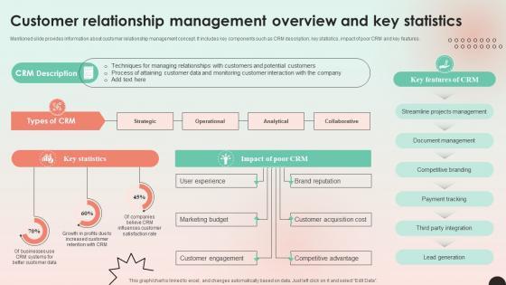 Mentioned slide provides information about customer relationship management concept. It includes key components such as CRM description, key statistics, impact of poor CRM and key features. Formulating a presentation can take up a lot of effort and time, so the content and message should always be the primary focus. The visuals of the PowerPoint can enhance the presenters message, so our Web Consulting Business Customer Relationship Management Overview And Key was created to help save time. Instead of worrying about the design, the presenter can concentrate on the message while our designers work on creating the ideal templates for whatever situation is needed. Slidegeeks has experts for everything from amazing designs to valuable content, we have put everything into Web Consulting Business Customer Relationship Management Overview And Key. Mentioned slide provides information about customer relationship management concept. It includes key components such as CRM description, key statistics, impact of poor CRM and key features.
