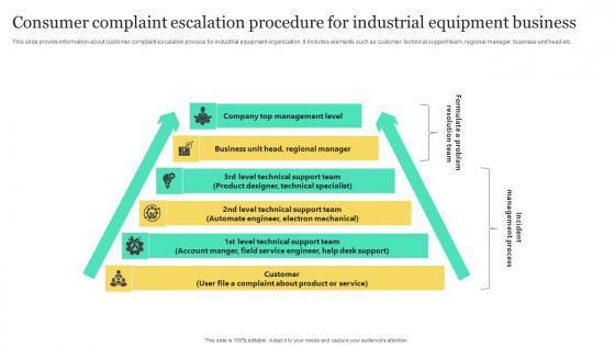 This slide provide information about customer complaint escalation process for industrial equipment organization. It includes elements such as customer, technical support team, regional manager, business unit head etc. Pitch your topic with ease and precision using this Consumer Complaint Escalation Procedure For Industrial Equipment Business Brochure Pdf. This layout presents information on Consumer Complaint, Escalation Procedure, Industrial Equipment Business. It is also available for immediate download and adjustment. So, changes can be made in the color, design, graphics or any other component to create a unique layout. This slide provide information about customer complaint escalation process for industrial equipment organization. It includes elements such as customer, technical support team, regional manager, business unit head etc.