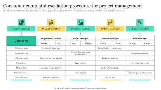 This slide explains distinct levels of escalation that is used to manage project issues quickly. It includes components such as scheduling, instruction, customers, support problems, etc. Showcasing this set of slides titled Consumer Complaint Escalation Procedure For Project Management Ideas Pdf. The topics addressed in these templates are Consumer Complaint, Escalation Procedure, Project Management. All the content presented in this PPT design is completely editable. Download it and make adjustments in color, background, font etc. as per your unique business setting. This slide explains distinct levels of escalation that is used to manage project issues quickly. It includes components such as scheduling, instruction, customers, support problems, etc.