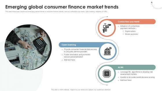 This slide showcases current and emerging market trends in consumer finance industry such as contactless payments, open banking, adoption of AI and ML. There are so many reasons you need a Emerging Global Consumer Global Consumer Financial Ppt Sample CRP DK SS V. The first reason is you can not spend time making everything from scratch, Thus, Slidegeeks has made presentation templates for you too. You can easily download these templates from our website easily. This slide showcases current and emerging market trends in consumer finance industry such as contactless payments, open banking, adoption of AI and ML.
