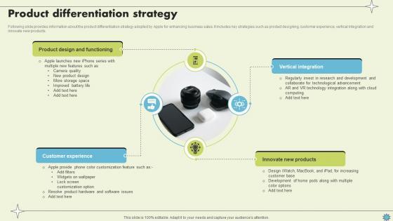 Following slide provides information about the product differentiation strategy adopted by Apple for enhancing business sales. It includes key strategies such as product designing, customer experience, vertical integration and innovate new products.Crafting an eye-catching presentation has never been more straightforward. Let your presentation shine with this tasteful yet straightforward Product Differentiation Strategy Consumer Electronics Company Profile CP SS V template. It offers a minimalistic and classy look that is great for making a statement. The colors have been employed intelligently to add a bit of playfulness while still remaining professional. Construct the ideal Product Differentiation Strategy Consumer Electronics Company Profile CP SS V that effortlessly grabs the attention of your audience Begin now and be certain to wow your customers Following slide provides information about the product differentiation strategy adopted by Apple for enhancing business sales. It includes key strategies such as product designing, customer experience, vertical integration and innovate new products.