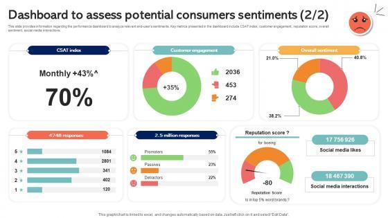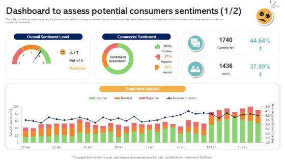 This slide provides information regarding the performance dashboard to analyze relevant end-users sentiments. Key metrics presented in the dashboard include overall sentiment level, sentiment score, and comments sentiments. Do you have an important presentation coming up Are you looking for something that will make your presentation stand out from the rest Look no further than Dashboard To Assess Potential Consumers Sentiments Emotionally Intelligent Insights Leveraging AI SS V. With our professional designs, you can trust that your presentation will pop and make delivering it a smooth process. And with Slidegeeks, you can trust that your presentation will be unique and memorable. So why wait Grab Dashboard To Assess Potential Consumers Sentiments Emotionally Intelligent Insights Leveraging AI SS V today and make your presentation stand out from the rest This slide provides information regarding the performance dashboard to analyze relevant end-users sentiments. Key metrics presented in the dashboard include overall sentiment level, sentiment score, and comments sentiments.