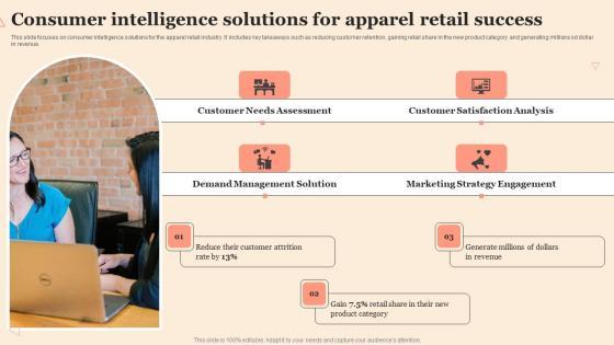 This slide focuses on consumer intelligence solutions for the apparel retail industry. It includes key takeaways such as reducing customer retention, gaining retail share in the new product category and generating millions od dollar in revenue.Showcasing this set of slides titled Consumer Intelligence Solutions For Apparel Retail Success Download Pdf The topics addressed in these templates are Needs Assessment, Demand Management Solution, Marketing Strategy Engagement All the content presented in this PPT design is completely editable. Download it and make adjustments in color, background, font etc. as per your unique business setting. This slide focuses on consumer intelligence solutions for the apparel retail industry. It includes key takeaways such as reducing customer retention, gaining retail share in the new product category and generating millions od dollar in revenue.