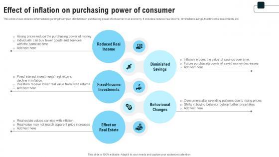 This slide shows detailed information regarding the impact of inflation on purchasing power of consumer in an economy. It includes reduced real income, diminished savings, fixed income investments, etc. Slidegeeks is here to make your presentations a breeze with Effect Of Inflation On Purchasing Power Of Consumer Strategies For Inflation A Tactical Guide Fin SS V With our easy-to-use and customizable templates, you can focus on delivering your ideas rather than worrying about formatting. With a variety of designs to choose from, you are sure to find one that suits your needs. And with animations and unique photos, illustrations, and fonts, you can make your presentation pop. So whether you are giving a sales pitch or presenting to the board, make sure to check out Slidegeeks first This slide shows detailed information regarding the impact of inflation on purchasing power of consumer in an economy. It includes reduced real income, diminished savings, fixed income investments, etc.