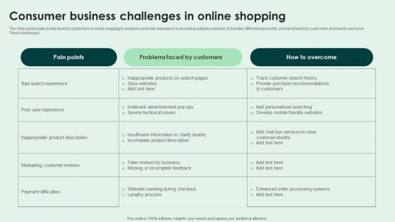The slide carries pain points faced by customers in online shopping to enhance customer experience by providing suitable solutions. It includes different pain points, problems faced by customers and how to overcome These challenges. Pitch your topic with ease and precision using this Consumer Business Challenges In Online Shopping Summary Pdf. This layout presents information on Pain Points, Problems Faced By Customers. It is also available for immediate download and adjustment. So, changes can be made in the color, design, graphics or any other component to create a unique layout. The slide carries pain points faced by customers in online shopping to enhance customer experience by providing suitable solutions. It includes different pain points, problems faced by customers and how to overcome These challenges.