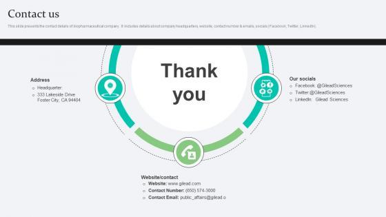 This slide presents the contact details of the biopharmaceuticals company. It includes details about company headquarters, website, contact number, socials Facebook, Twitter, LinkedIn.There are so many reasons you need a Contact Us Medical Research Organization Pitch Deck. The first reason is you can not spend time making everything from scratch, Thus, Slidegeeks has made presentation templates for you too. You can easily download these templates from our website easily. This slide presents the contact details of the biopharmaceuticals company. It includes details about company headquarters, website, contact number, socials Facebook, Twitter, LinkedIn.