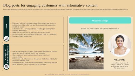 This slide represents the blog post created by travel influencers to build strong relationship with customers and to effectively engage customers. It includes details related to need and strategies to effectively create blog posts. Do you have to make sure that everyone on your team knows about any specific topic I yes, then you should give Guide To Winning Tourism Blog Posts For Engaging Customers With Informative Content Background Pdf a try. Our experts have put a lot of knowledge and effort into creating this impeccable Guide To Winning Tourism Blog Posts For Engaging Customers With Informative Content Background Pdf You can use this template for your upcoming presentations, as the slides are perfect to represent even the tiniest detail. You can download these templates from the Slidegeeks website and these are easy to edit. So grab these today This slide represents the blog post created by travel influencers to build strong relationship with customers and to effectively engage customers. It includes details related to need and strategies to effectively create blog posts.