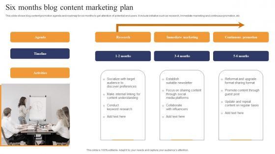 This slide shows blog content promotion agenda and roadmap for six months to get attention of potential end users. It include initiative such as research, immediate marketing and continuous promotion, etc. Showcasing this set of slides titled Six Months Blog Content Marketing Plan Diagrams Pdf The topics addressed in these templates are Immediate Marketing, Continuous Promotion All the content presented in this PPT design is completely editable. Download it and make adjustments in color, background, font etc. as per your unique business setting. This slide shows blog content promotion agenda and roadmap for six months to get attention of potential end users. It include initiative such as research, immediate marketing and continuous promotion, etc.