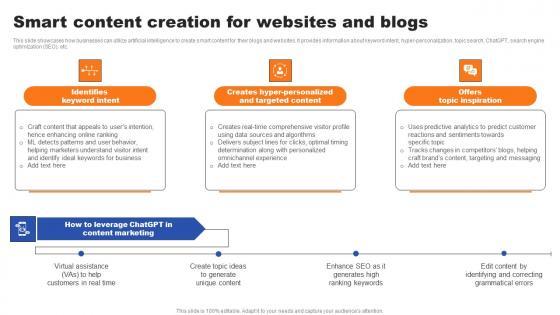 This slide showcases how businesses can utilize artificial intelligence to create smart content for their blogs and websites. It provides information about keyword intent, hyper-personalization, topic search, ChatGPT, search engine optimization SEO, etc. Do you have an important presentation coming up Are you looking for something that will make your presentation stand out from the rest Look no further than Smart Content Creation For Websites And Blogs Ppt Summary Examples PDF. With our professional designs, you can trust that your presentation will pop and make delivering it a smooth process. And with Slidegeeks, you can trust that your presentation will be unique and memorable. So why wait Grab Smart Content Creation For Websites And Blogs Ppt Summary Examples PDF today and make your presentation stand out from the rest This slide showcases how businesses can utilize artificial intelligence to create smart content for their blogs and websites. It provides information about keyword intent, hyper-personalization, topic search, ChatGPT, search engine optimization SEO, etc.
