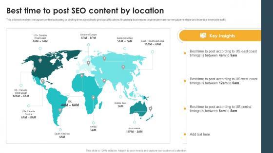 This slide shows best Instagram content uploading or posting time according to geological locations. It can help businesses to generate maximum engagement rate and increase in website traffic. Want to ace your presentation in front of a live audience Our Best Time To Post Seo Content By Location Seo Content Plan To Drive Strategy SS V can help you do that by engaging all the users towards you. Slidegeeks experts have put their efforts and expertise into creating these impeccable powerpoint presentations so that you can communicate your ideas clearly. Moreover, all the templates are customizable, and easy-to-edit and downloadable. Use these for both personal and commercial use. This slide shows best Instagram content uploading or posting time according to geological locations. It can help businesses to generate maximum engagement rate and increase in website traffic.
