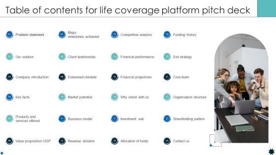 Welcome to our selection of the Table Of Contents For Life Coverage Platform Pitch Deck These are designed to help you showcase your creativity and bring your sphere to life. Planning and Innovation are essential for any business that is just starting out. This collection contains the designs that you need for your everyday presentations. All of our PowerPoints are 100Percent editable, so you can customize them to suit your needs. This multi-purpose template can be used in various situations. Grab these presentation templates today. Our Table Of Contents For Life Coverage Platform Pitch Deck are topically designed to provide an attractive backdrop to any subject. Use them to look like a presentation pro.