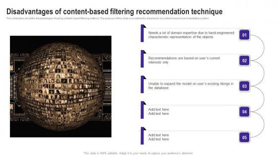 This slide talks about the disadvantages of using content-based filtering method. The purpose of this slide is to outline the drawbacks of content-based recommendation system.Welcome to our selection of the Disadvantages Of Content Based Filtering Recommendation Technique Demonstration PDF. These are designed to help you showcase your creativity and bring your sphere to life. Planning and Innovation are essential for any business that is just starting out. This collection contains the designs that you need for your everyday presentations. All of our PowerPoints are 100 precent editable, so you can customize them to suit your needs. This multi-purpose template can be used in various situations. Grab these presentation templates today