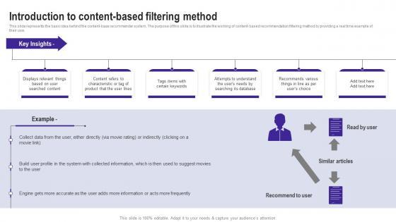 This slide represents the basic idea behind the content base recommender system. The purpose of this slide is to illustrate the working of content based recommendation filtering method by providing a real time example of their use. Presenting this PowerPoint presentation, titled Introduction To Content Based Filtering Method Use Cases Of Filtering Methods Summary Pdf, with topics curated by our researchers after extensive research. This editable presentation is available for immediate download and provides attractive features when used. Download now and captivate your audience. Presenting this Introduction To Content Based Filtering Method Use Cases Of Filtering Methods Summary Pdf. Our researchers have carefully researched and created these slides with all aspects taken into consideration. This is a completely customizable Introduction To Content Based Filtering Method Use Cases Of Filtering Methods Summary Pdf that is available for immediate downloading. Download now and make an impact on your audience. Highlight the attractive features available with our PPTs. This slide represents the basic idea behind the content base recommender system. The purpose of this slide is to illustrate the working of content based recommendation filtering method by providing a real time example of their use.