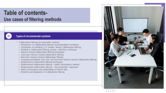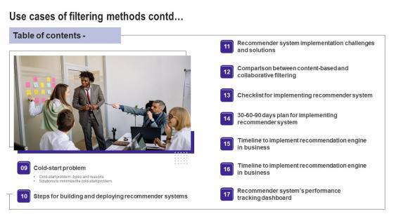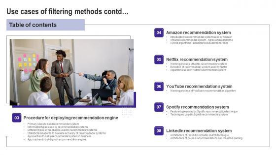 This Table Of Contents Use Cases Of Filtering Methods Pictures Pdf is perfect for any presentation, be it in front of clients or colleagues. It is a versatile and stylish solution for organizing your meetings. The Table Of Contents Use Cases Of Filtering Methods Pictures Pdf features a modern design for your presentation meetings. The adjustable and customizable slides provide unlimited possibilities for acing up your presentation. Slidegeeks has done all the homework before launching the product for you. So, do not wait, grab the presentation templates today Our Table Of Contents Use Cases Of Filtering Methods Pictures Pdf are topically designed to provide an attractive backdrop to any subject. Use them to look like a presentation pro.