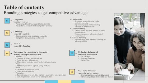 The Table Of Contents Branding Strategies To Get Competitive Advantage Structure Pdf is a compilation of the most recent design trends as a series of slides. It is suitable for any subject or industry presentation, containing attractive visuals and photo spots for businesses to clearly express their messages. This template contains a variety of slides for the user to input data, such as structures to contrast two elements, bullet points, and slides for written information. Slidegeeks is prepared to create an impression. Our Table Of Contents Branding Strategies To Get Competitive Advantage Structure Pdf are topically designed to provide an attractive backdrop to any subject. Use them to look like a presentation pro.