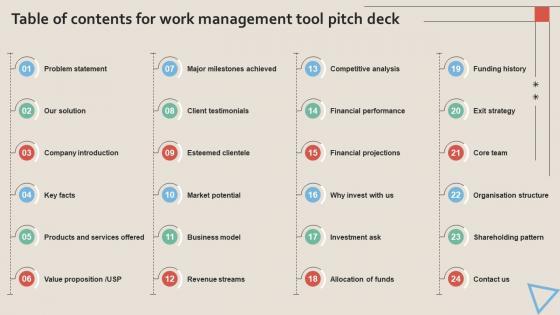 Welcome to our selection of the Table Of Contents For Work Management Tool Pitch Deck. These are designed to help you showcase your creativity and bring your sphere to life. Planning and Innovation are essential for any business that is just starting out. This collection contains the designs that you need for your everyday presentations. All of our PowerPoints are 100 percent editable, so you can customize them to suit your needs. This multi-purpose template can be used in various situations. Grab these presentation templates today. Our Table Of Contents For Work Management Tool Pitch Deck are topically designed to provide an attractive backdrop to any subject. Use them to look like a presentation pro.