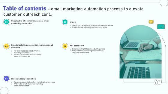 Do you have an important presentation coming up Are you looking for something that will make your presentation stand out from the rest Look no further than Table Of Contents Email Marketing Automation Process To Elevate Customer Outreach. With our professional designs, you can trust that your presentation will pop and make delivering it a smooth process. And with Slidegeeks, you can trust that your presentation will be unique and memorable. So why wait Grab Table Of Contents Email Marketing Automation Process To Elevate Customer Outreach today and make your presentation stand out from the rest Our Table Of Contents Email Marketing Automation Process To Elevate Customer Outreach are topically designed to provide an attractive backdrop to any subject. Use them to look like a presentation pro.