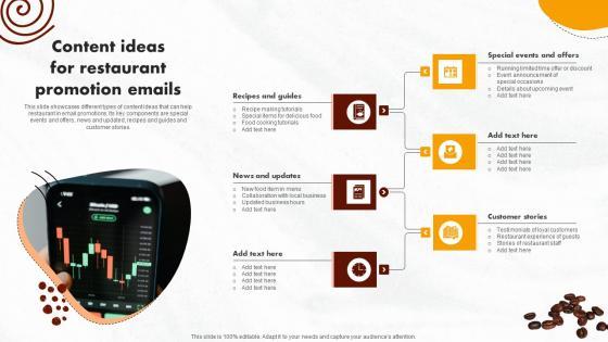 This slide showcases different types of content ideas that can help restaurant in email promotions. Its key components are special events and offers, news and updated, recipes and guides and customer stories Do you have an important presentation coming up Are you looking for something that will make your presentation stand out from the rest Look no further than Coffeehouse Promotion Techniques To Boost Revenue Content Ideas For Restaurant Promotion Emails Microsoft PDF. With our professional designs, you can trust that your presentation will pop and make delivering it a smooth process. And with Slidegeeks, you can trust that your presentation will be unique and memorable. So why wait Grab Coffeehouse Promotion Techniques To Boost Revenue Content Ideas For Restaurant Promotion Emails Microsoft PDF today and make your presentation stand out from the rest