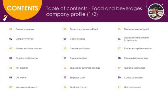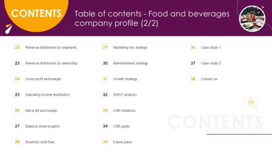 Slidegeeks is here to make your presentations a breeze with Table Of Contents Food And Beverages Company Profile 1 2 Ppt Powerpoint CP SS V With our easy-to-use and customizable templates, you can focus on delivering your ideas rather than worrying about formatting. With a variety of designs to choose from, you are sure to find one that suits your needs. And with animations and unique photos, illustrations, and fonts, you can make your presentation pop. So whether you are giving a sales pitch or presenting to the board, make sure to check out Slidegeeks first Our Table Of Contents Food And Beverages Company Profile 1 2 Ppt Powerpoint CP SS V are topically designed to provide an attractive backdrop to any subject. Use them to look like a presentation pro.