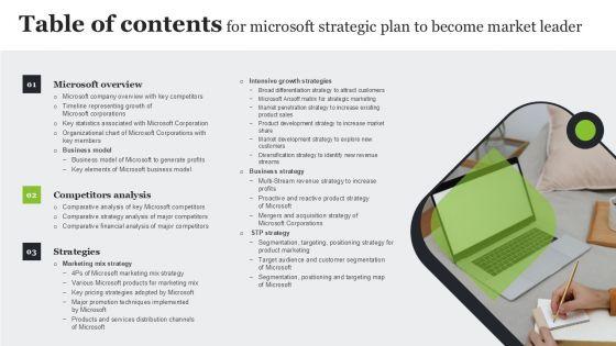 Do you know about Slidesgeeks Table Of Contents For Microsoft Strategic Plan To Become Market Leader Topics PDF These are perfect for delivering any kind od presentation. Using it, create PowerPoint presentations that communicate your ideas and engage audiences. Save time and effort by using our pre-designed presentation templates that are perfect for a wide range of topic. Our vast selection of designs covers a range of styles, from creative to business, and are all highly customizable and easy to edit. Download as a PowerPoint template or use them as Google Slides themes.