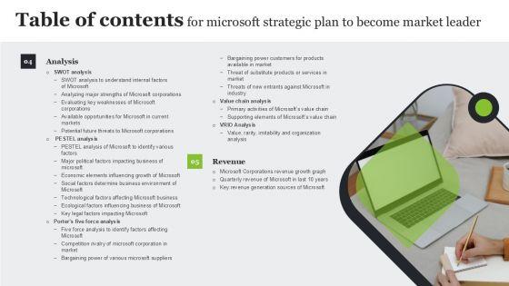 The Microsoft Strategic Plan To Become Market Leader Table Of Contents Clipart PDF is a compilation of the most recent design trends as a series of slides. It is suitable for any subject or industry presentation, containing attractive visuals and photo spots for businesses to clearly express their messages. This template contains a variety of slides for the user to input data, such as structures to contrast two elements, bullet points, and slides for written information. Slidegeeks is prepared to create an impression.
