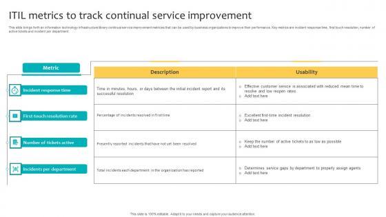 This slide brings forth an information technology infrastructure library continual service improvement metrices that can be used by business organizations to improve their performance. Key metrics are incident response time, first touch resolution, number of active tickets and incident per department. Pitch your topic with ease and precision using this ITIL Metrics To Track Continual Service Improvement Infographics Pdf. This layout presents information on Incident Response Time, Number Of Tickets Active, Incidents Per Department. It is also available for immediate download and adjustment. So, changes can be made in the color, design, graphics or any other component to create a unique layout. This slide brings forth an information technology infrastructure library continual service improvement metrices that can be used by business organizations to improve their performance. Key metrics are incident response time, first touch resolution, number of active tickets and incident per department.