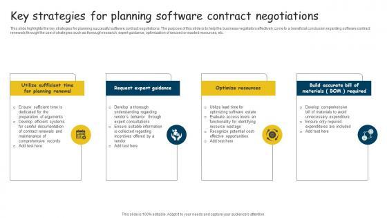 This slide highlights the key strategies for planning successful software contract negotiations. The purpose of this slide is to help the business negotiators effectively come to a beneficial conclusion regarding software contract renewals through the use of strategies such as thorough research, expert guidance, optimization of unused or wasted resources, etc.Pitch your topic with ease and precision using this Key Strategies For Planning Software Contract Negotiations Summary Pdf This layout presents information on Planning Renewal, Request Expert Guidance, Optimize Resources It is also available for immediate download and adjustment. So, changes can be made in the color, design, graphics or any other component to create a unique layout. This slide highlights the key strategies for planning successful software contract negotiations. The purpose of this slide is to help the business negotiators effectively come to a beneficial conclusion regarding software contract renewals through the use of strategies such as thorough research, expert guidance, optimization of unused or wasted resources, etc.