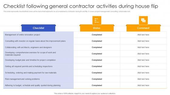 This slide represents checklist that covers all the tasks that required to be accomplished by contractor during fix and flip. It covers project management, consulting, collaboration etc. Here you can discover an assortment of the finest PowerPoint and Google Slides templates. With these templates, you can create presentations for a variety of purposes while simultaneously providing your audience with an eye catching visual experience. Download Deploying House Flipping BusiDeploying House Flipping Business Plan Checklist Following General Contractor Activities During House Flip Structure PDF to deliver an impeccable presentation. These templates will make your job of preparing presentations much quicker, yet still, maintain a high level of quality. Slidegeeks has experienced researchers who prepare these templates and write high quality content for you. Later on, you can personalize the content by editing the Deploying House Flipping BusiDeploying House Flipping Business Plan Checklist Following General Contractor Activities During House Flip Structure PDF.