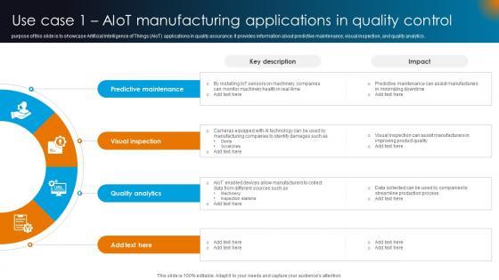 The purpose of this slide is to showcase Artificial Intelligence of Things AIoT applications in quality assurance. It provides information about predictive maintenance, visual inspection, and quality analytics. This modern and well-arranged Use Case 1 AIOT Manufacturing Applications In Quality Control AIOT Applications For Various Industries IoT SS V provides lots of creative possibilities. It is very simple to customize and edit with the Powerpoint Software. Just drag and drop your pictures into the shapes. All facets of this template can be edited with Powerpoint, no extra software is necessary. Add your own material, put your images in the places assigned for them, adjust the colors, and then you can show your slides to the world, with an animated slide included. The purpose of this slide is to showcase Artificial Intelligence of Things AIoT applications in quality assurance. It provides information about predictive maintenance, visual inspection, and quality analytics.