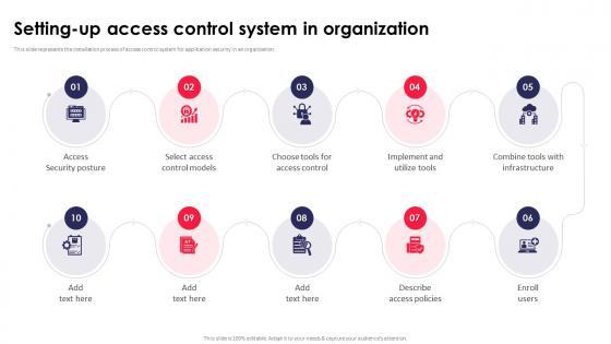 This slide represents the installation process of access control system for application security in an organization. Explore a selection of the finest Setting Up Access Control System In Organization Application Security Testing here. With a plethora of professionally designed and pre-made slide templates, you can quickly and easily find the right one for your upcoming presentation. You can use our Setting Up Access Control System In Organization Application Security Testing to effectively convey your message to a wider audience. Slidegeeks has done a lot of research before preparing these presentation templates. The content can be personalized and the slides are highly editable. Grab templates today from Slidegeeks. This slide represents the installation process of access control system for application security in an organization.