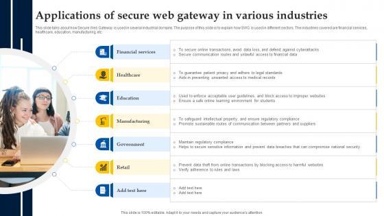 This slide talks about how Secure Web Gateway is used in several industrial domains. The purpose of this slide is to explain how SWG is used in different sectors. The industries covered are financial services, healthcare, education, manufacturing, etc. Present like a pro with Web Access Control Solution Applications Of Secure Web Gateway In Various Industries. Create beautiful presentations together with your team, using our easy-to-use presentation slides. Share your ideas in real-time and make changes on the fly by downloading our templates. So whether you are in the office, on the go, or in a remote location, you can stay in sync with your team and present your ideas with confidence. With Slidegeeks presentation got a whole lot easier. Grab these presentations today. This slide talks about how Secure Web Gateway is used in several industrial domains. The purpose of this slide is to explain how SWG is used in different sectors. The industries covered are financial services, healthcare, education, manufacturing, etc.