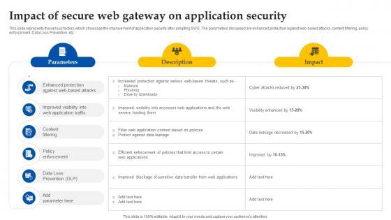 This slide represents the various factors which showcase the improvement of application security after adopting SWG. The parameters discussed are enhanced protection against web-based attacks, content filtering, policy enforcement, Data Loss Prevention, etc. Welcome to our selection of the Web Access Control Solution Impact Of Secure Web Gateway On Application Security. These are designed to help you showcase your creativity and bring your sphere to life. Planning and Innovation are essential for any business that is just starting out. This collection contains the designs that you need for your everyday presentations. All of our PowerPoints are 100Percent editable, so you can customize them to suit your needs. This multi-purpose template can be used in various situations. Grab these presentation templates today. This slide represents the various factors which showcase the improvement of application security after adopting SWG. The parameters discussed are enhanced protection against web-based attacks, content filtering, policy enforcement, Data Loss Prevention, etc.